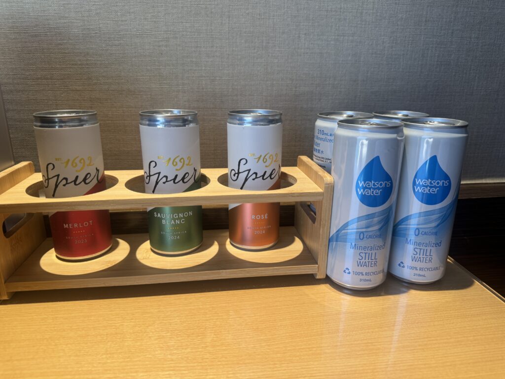 お水は4本置いてありました。(写真左は有料のスパークリングワインです)前回宿泊したマリオット海洋公園もだけど、香港のマリオット系列のお水はどこもペッドボトルではなく缶or瓶タイプになっていますね。去年泊まった時はペッドボトルだったなぁ〜