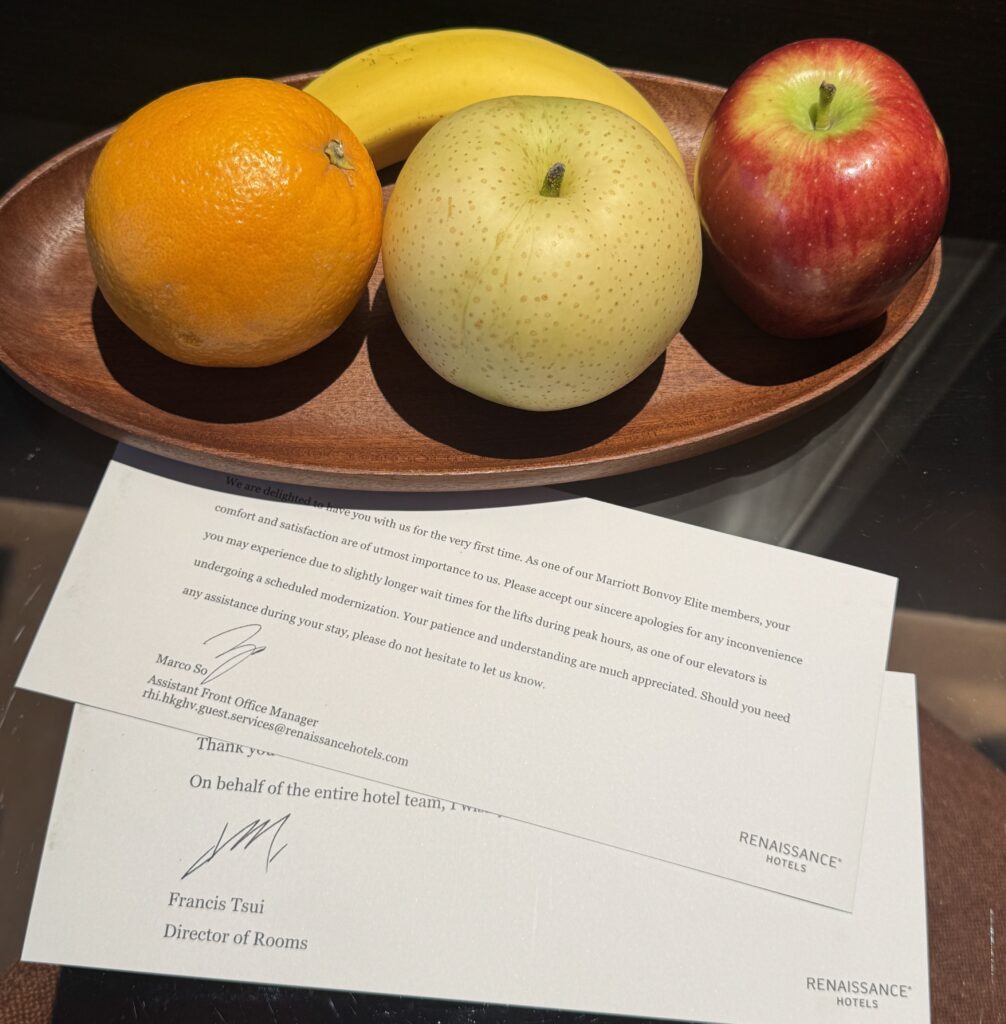 エリート特典のウェルカムギフトはフルーツで、お昼過ぎにお部屋に戻った時に置いてくれていました。