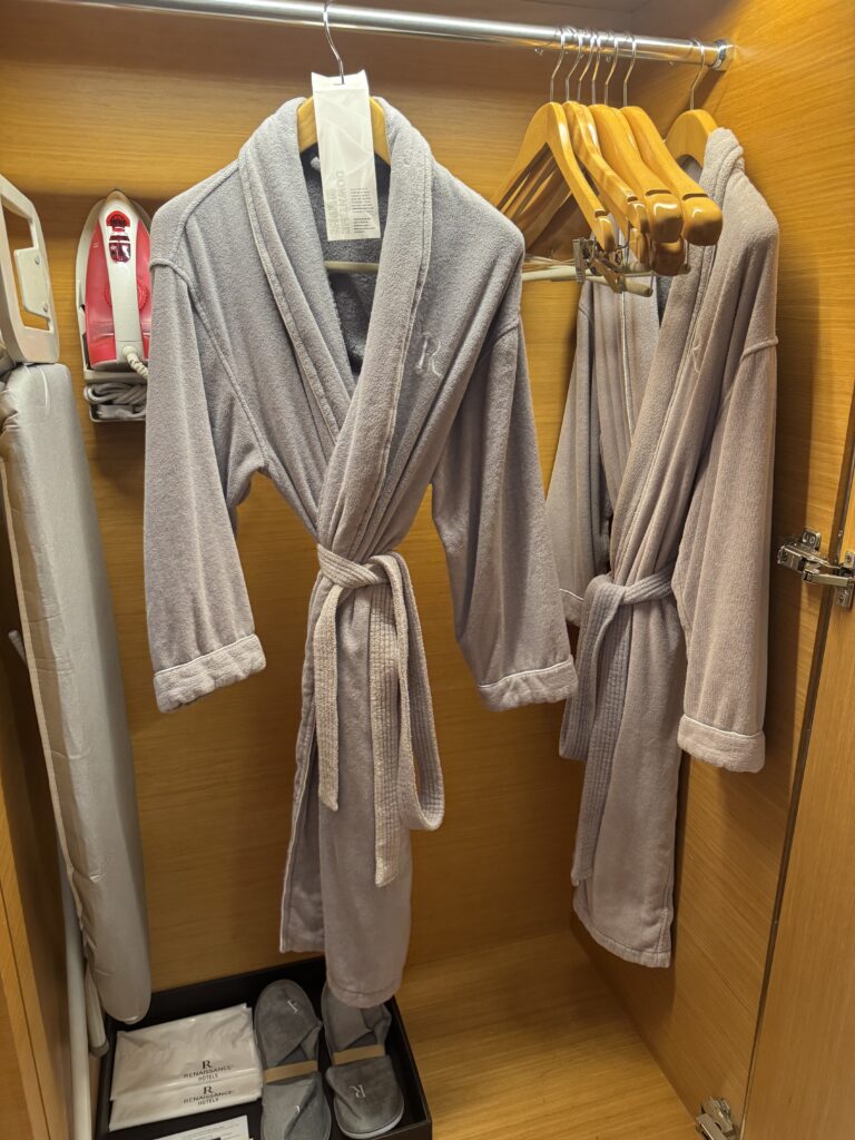 ここのルネッサンスはバスローブとスリッパがロゴ入りで可愛い!皆さんはバスローブ着る派ですか?パジャマ持参派ですか?私はバスローブ必須派なので嬉しかったです。